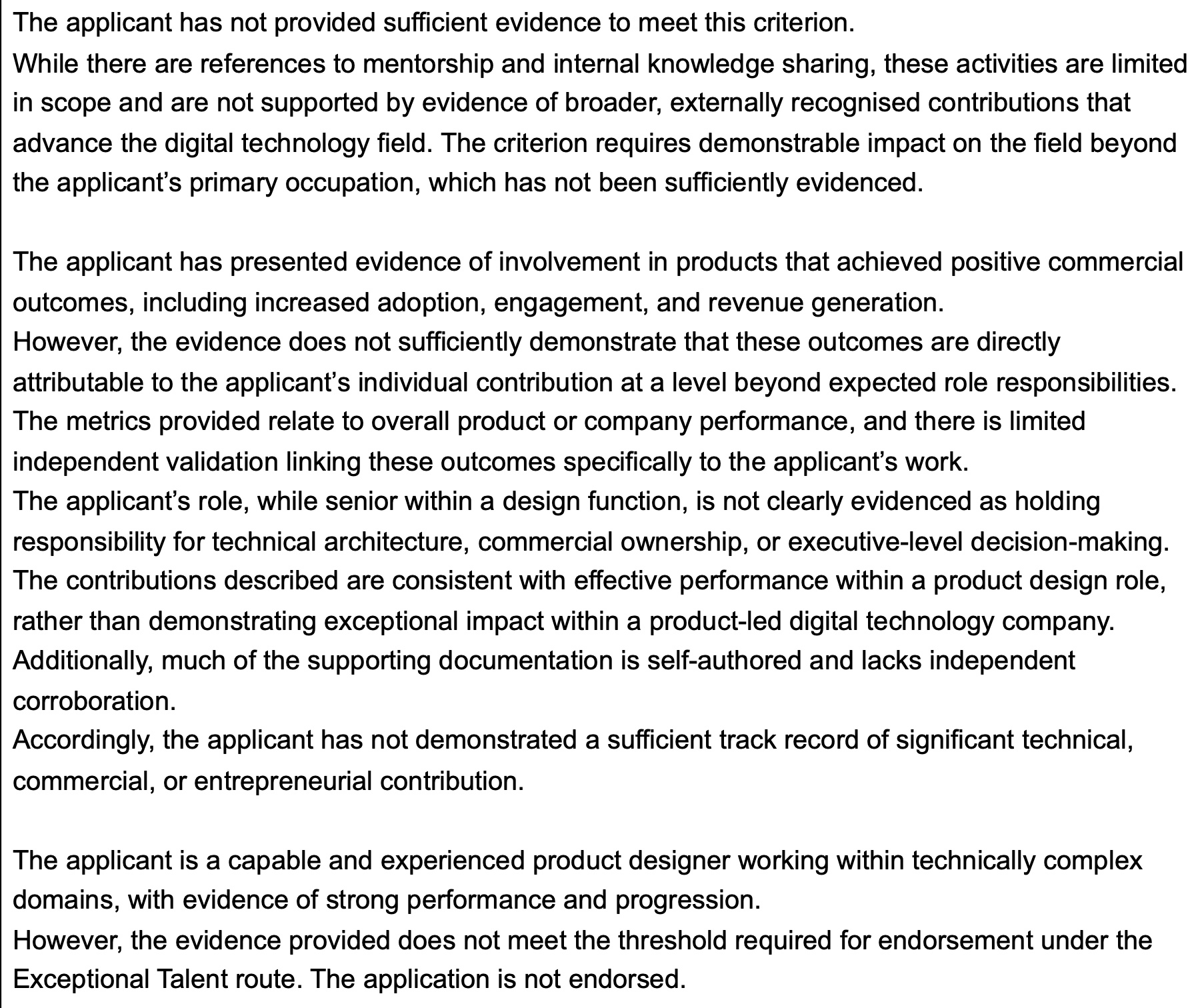 I applied for Exceptional Talent (outside UK) as a Staff Product Designer in cybersecurity / developer tooling.