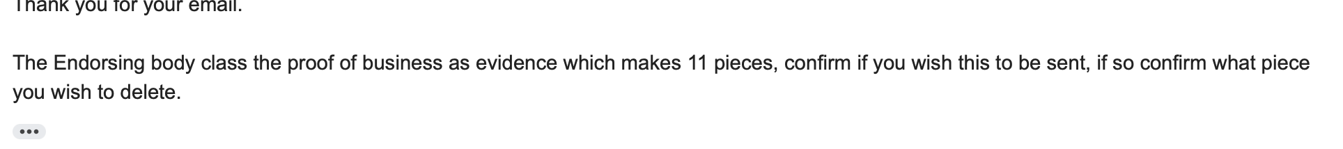 @Maya thats a mail from the home office. i told them but they got back to me saying it counted as a single evidence meaning i should delete one from my 10 evidences submitted because the proof makes it 11. i deleted the proof because the proof of business is highlighted in my OC3